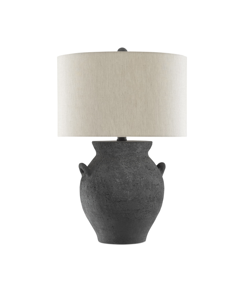 Made of terracotta in a black ash finish, the Anza Table Lamp mimics a ginger jar shape with cleverly placed handles. The roughness of the surface of the terracotta gives this dark gray lamp an extra dose of texture. Wrought iron hardware in a satin black finish is a seamless addition, as is the matching terracotta finial that fastens the natural linen drum shade to the lamp.