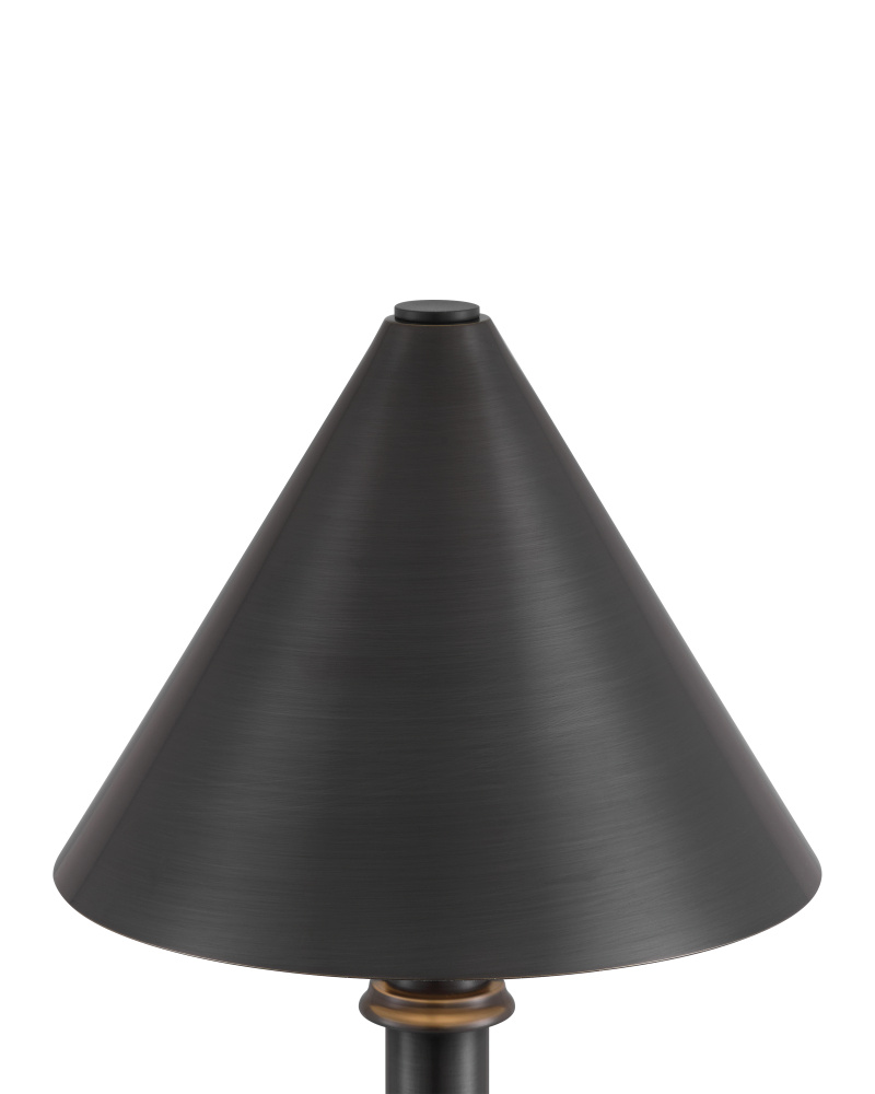 The Sortie Brass Cordless Table Lamp is a gold lamp that is always ready for action. The metal base in a brass finish holds the on/off switch. The telescoping body of the petite lamp is covered in a dark gray faux shagreen, and a frosted glass globe sits atop the lamp. to recharge, simply place the Sortie on a separate charging pad.