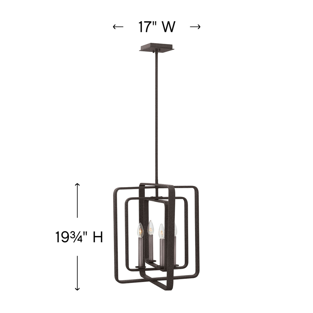 Quentin is constructed of angular forms that create a striking geometric interplay. This stem-hung collection features intersecting rectangles in a bold Aged Zinc finish, forming a modern silhouette. Candle sleeves in Antique Nickel add a distinctively vintage feel that is both hip and historical.