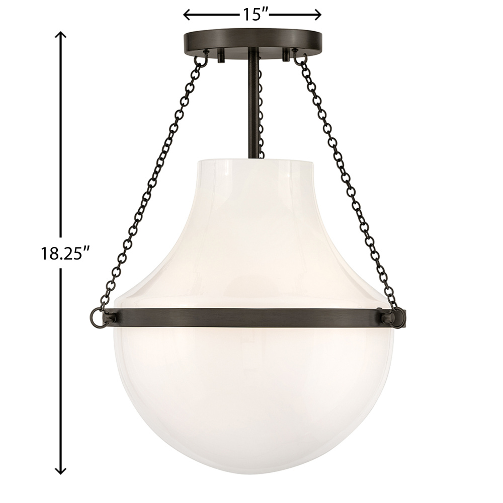 Fusing a sculpted, modern form with classically styled details, Collins features a transitional teardrop shade crafted from blown, cased opal glass. A central metal band and delicate chain uprights are available in Heritage Brass or Black Oxide finishes.