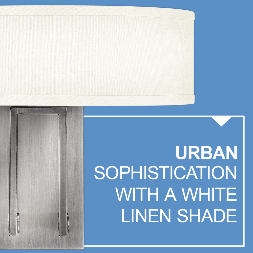 Hampton is a modern transitional design, offering the ultimate in urban sophistication. The minimal, rectangular frame is softened by a contemporary off-white linen drum shade.