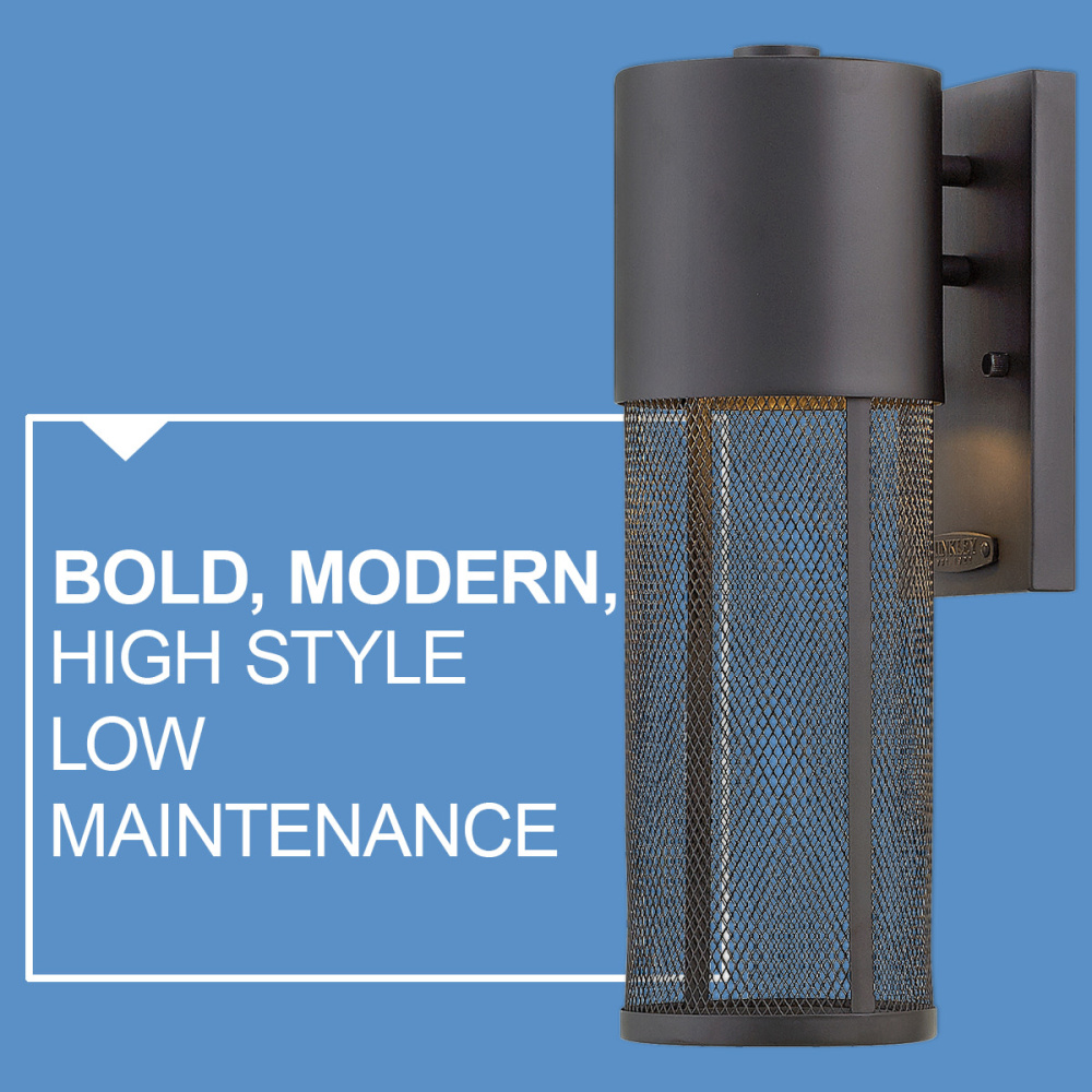 Aria is a contemporary style that effortlessly complements the façade of any exterior. Its modern shape in durable aluminum is enhanced by a stainless steel mesh shade. Aria’s high style and low maintenance comes standard Dark Sky compliant.