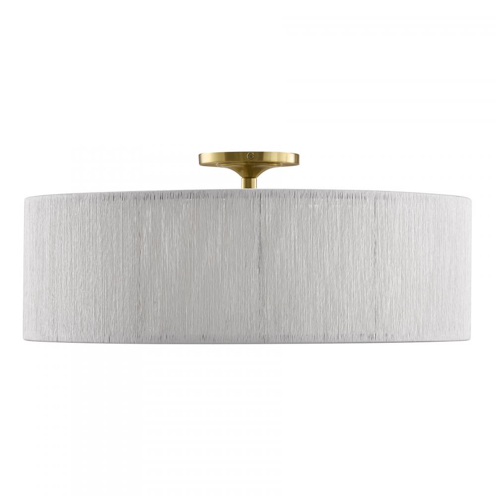 The Savoy House Maynard 4-light flush mount boosts the style and illumination of any space. Its shade is intricately woven with soft white rope, infusing your room with relaxed organic style. The Warm Brass finish adds a hint of glamour. Maynard is 9.38" in height and 22" in width. It uses four candelabra size bulbs of up to 60 watts per bulb. Bulbs not included.