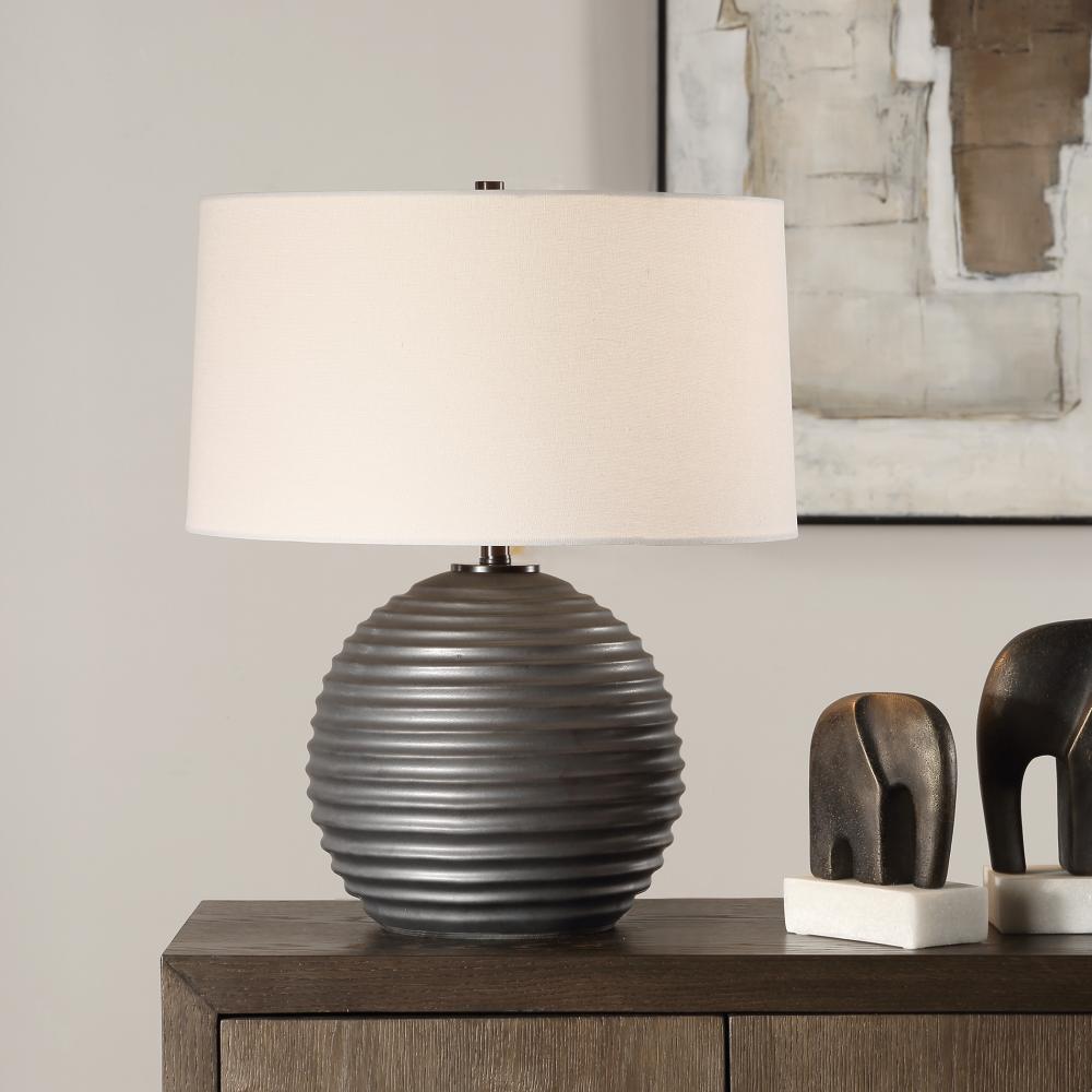 The Chelsom Table Lamp Features A Ribbed Ceramic Base Finished In A Satin Dark Bronze Glaze Accented With Matching Dark Bronze Hardware. A White Linen Round Hardback Shade Completes The Piece.