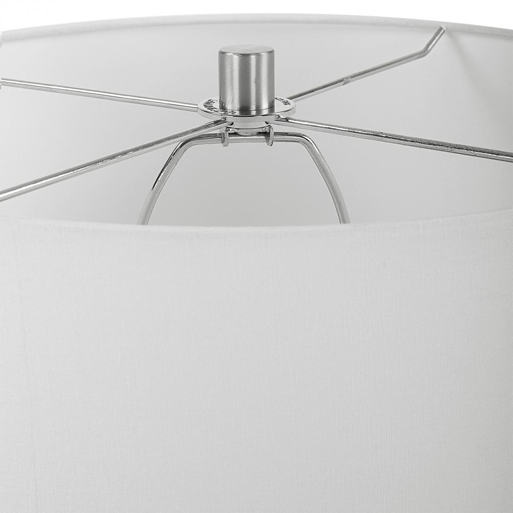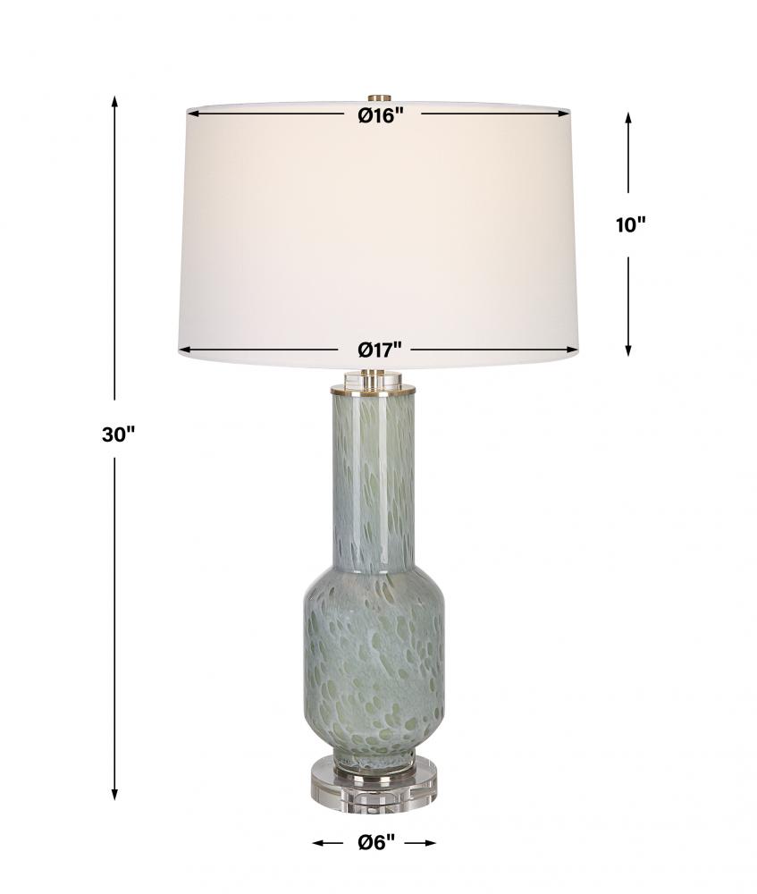 This Sophisticated Lamp Displays A Unique Bubble Glass Base in Tranquil Aqua Gray with Plated Brushed Nickel Accents and Thick Crystal Details. Tapered Hardback Shade is Covered in A Crisp White Linen Fabric.