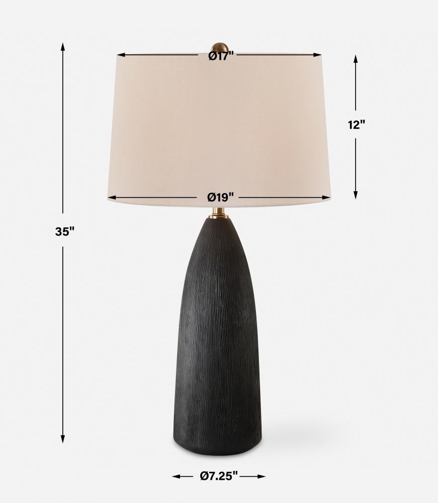 The Jett Table Lamp Showcases A Matte Black Ceramic Base With Organic Texturing, Accented With Plated Antique Brass Details. The Tapered Round Shade Is A Casual White Linen Fabric.