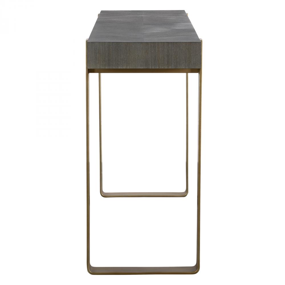 Contemporary in Style, This Console Features A Striking Diamond Ash Veneer Top in A Dark Walnut Stain with Light Gray Glazing. The Iron Strap Legs Are Finished in A Warm Brushed Brass.