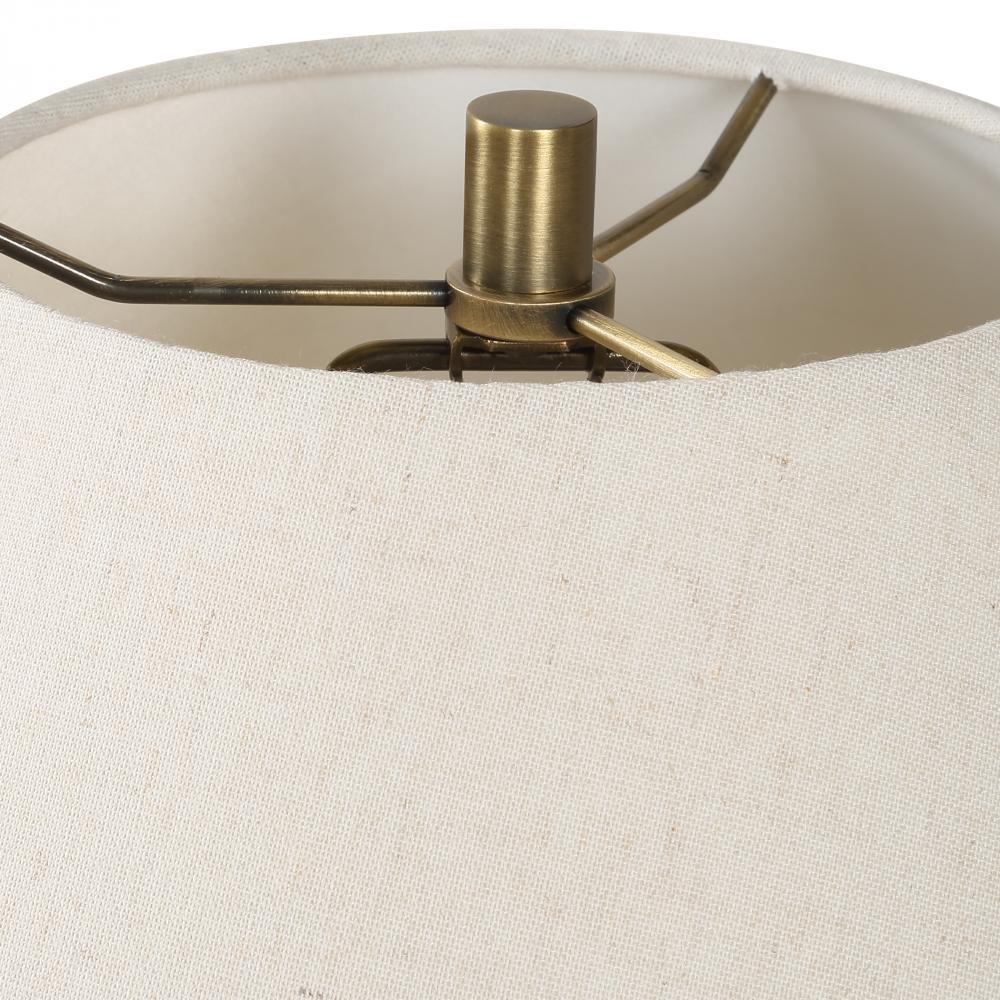 The Meryl Table Lamp Showcases A Hand Crafted Porcelain Base Finished In An Aged White With Rust Distressing Over Organic Textural Lines That Are Accented With Plated Antique Brass Detail. The Coolie Style Large Round Shade Is Made In An Off-white Linen Fabric.