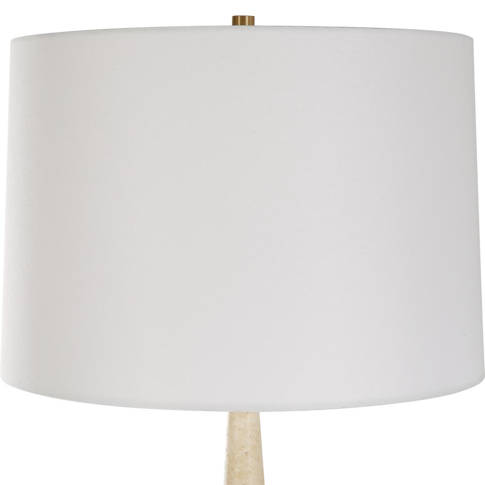 This Table Lamp Combines Modern Silhouette with Organic Textures and Materials Featuring Two Cone Shaped Pieces of Light Beige Travertine Separated By Iron Details Finished in Plated Brushed Brass. The Slightly Tapered Round Hardback Shade is Covered in White Linen Fabric.