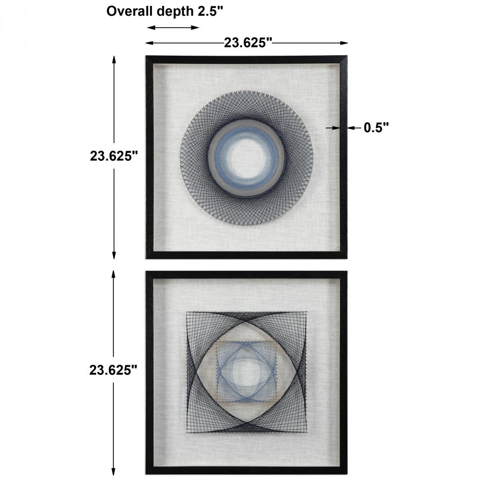 These Fun Shadow Boxes Feature 3-dimensional Layered String Art, Hand Threaded Around Individually Hammered Pin Nails in Easy Shades of Blue, Over A Neutral Linen Backing with A Black Pine Frame.