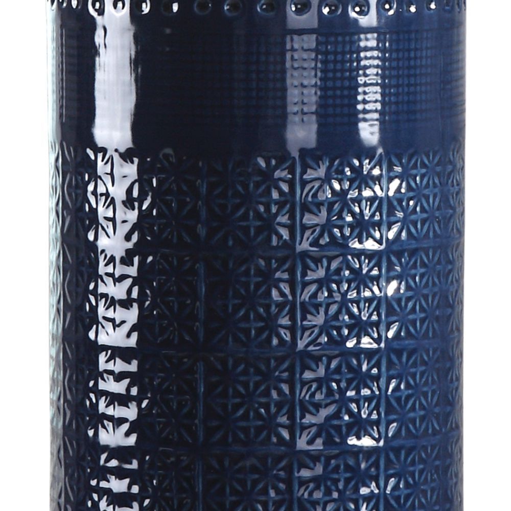 Intricately Embossed Ceramic Finished in A Royal Blue Glaze, Accented with Brushed Nickel Plated Details. The Round Hardback Drum Shade is A White Linen Fabric with Natural Slubbing.