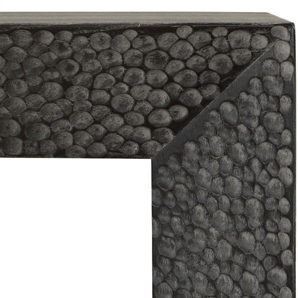 Crafted From Elm Veneers And Solids, This Organic Console Table Features A Chiseled Texture Face In Rich Ebony. Its Timeless Appeal Can Easily Be Added To Any Entryway, Hallway, Or Living Space, Providing Functionality And Elegance.
