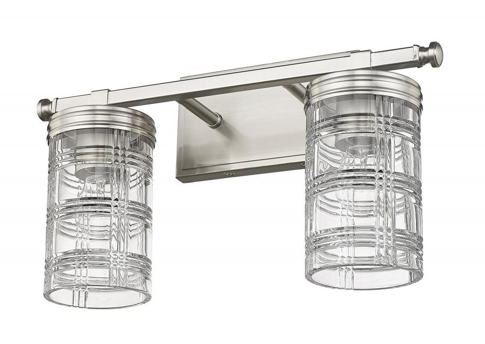 Adorn a traditional-leaning bathroom countertop vanity with this sophisticated, classically designed transitional two-light vanity wall sconce. With an old-world restoration flair, two cut crystal-inspired glass shades present a handsome Glen plaid pattern, creating a scintillated effect across countertops and walls. A shiny brushed nickel plate and caps complement cool tone metal fixtures and hardware, lending a timeless look to this metropolitan two-light vanity wall sconce, transforming bathroom interiors.