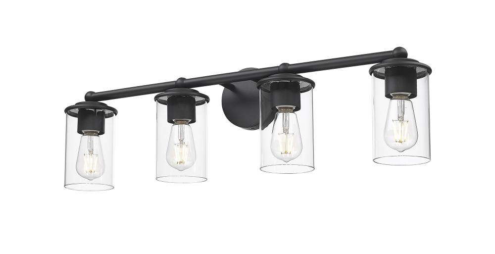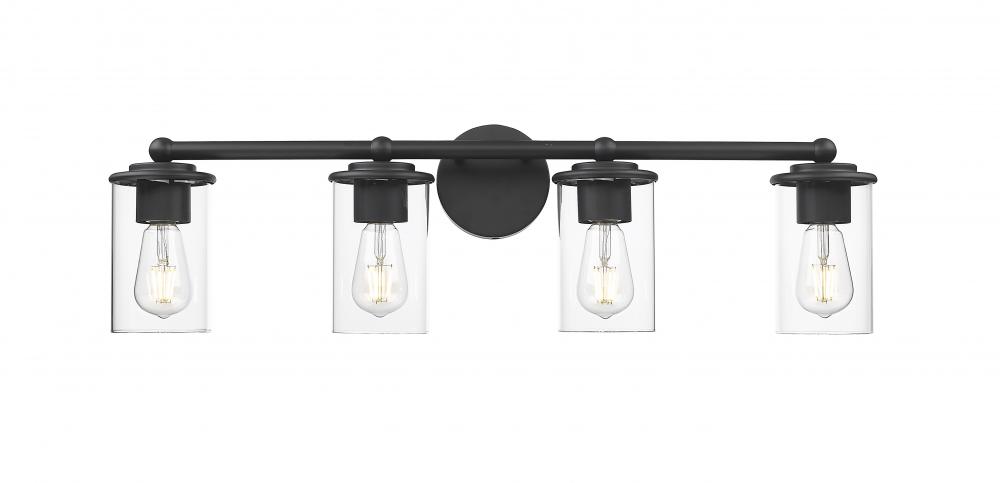 Appreciate the versatility of modern simplicity in a chic, modern four-light vanity fixture. From the Thayer collection, its a charming, understated design that pairs graceful curvature with a high contrast matte black finish and cylinders of crystal clear glass for bright, direct illumination ideal for a master or guest bath.