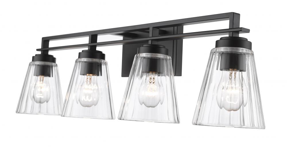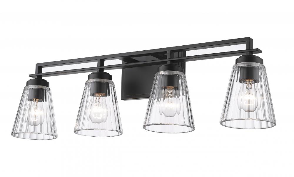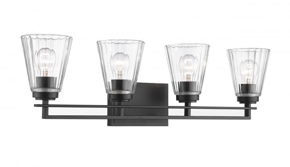 A generous width and upscale aesthetic go a long way toward highlighting an ensuite or guest bath vanity with a four-light vanity light from the Lyna collection. This chic fixture reflects a touch of nautical charm and embodies the importance of symmetry and style. A linear frame fashioned of bold matte black finish steel supports four glam clear ribbed glass cone shades, delivering an uncompromising level of romantic essence.